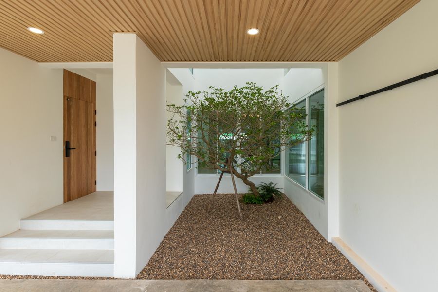 ลำดับการรับรู้ของพื้นที่ เริ่มตั้งแต่การเข้าบ้าน การค่อย ๆ เปิดมุมมอง ไปจนถึงพื้นที่ส่วนตัว ทุกจังหวะถูกออกแบบให้ผู้อยู่อาศัยรู้สึกผ่อนคลาย เป็นส่วนตัว และเชื่อมโยงกันผ่านสวนกลางบ้าน