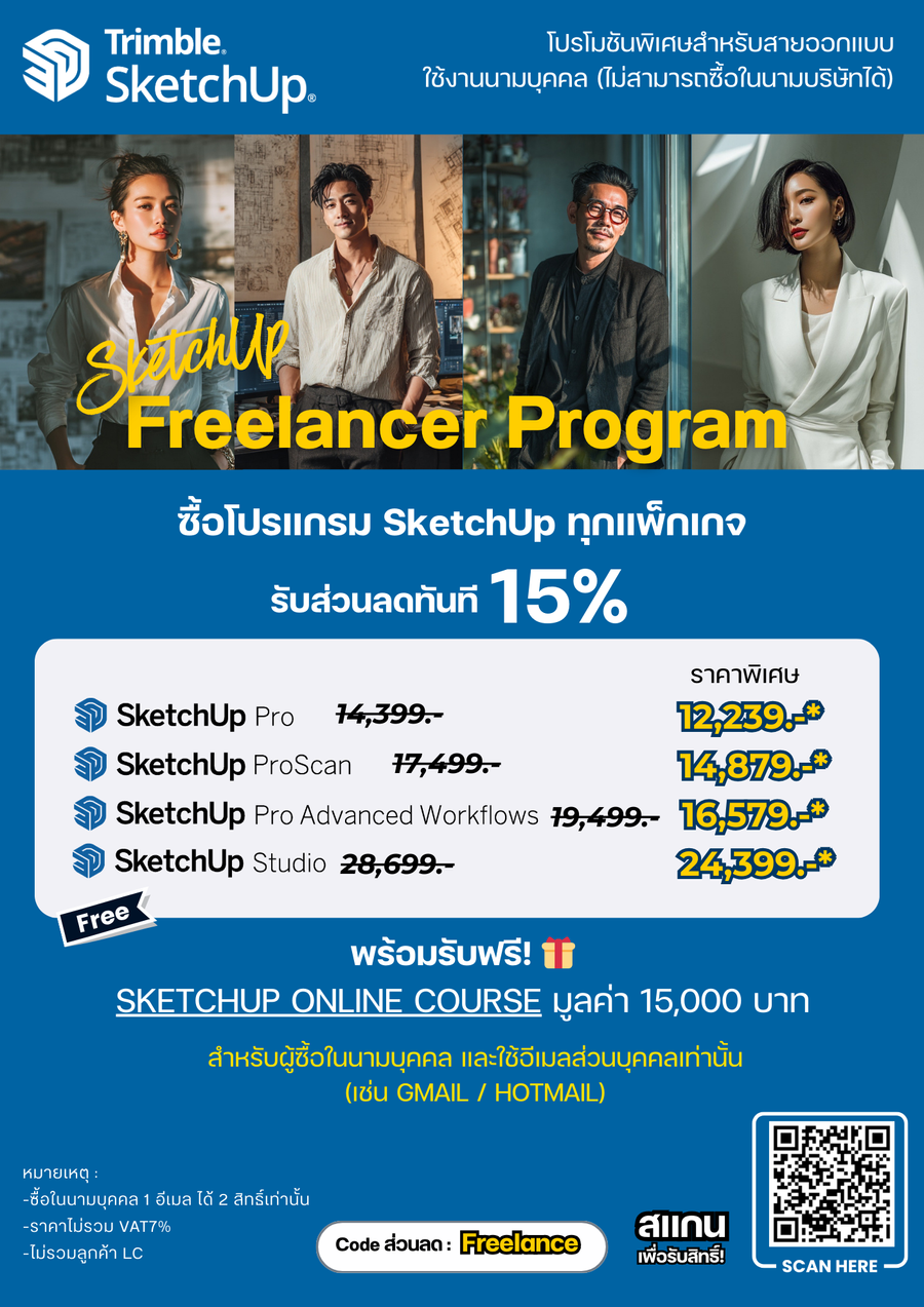 📌ซื้อโปรแกรม Sketchup แพ็กเกจใดก็ได้ รับส่วนลดทันที 15% (ราคาไม่รวม VAT 7%) พร้อมรับฟรีทันที! SketchUp Online Course มูลค่า 15,000 บาท เปลี่ยนคุณจาก “ใช้งานได้” → “ทำงานได้เร็วกว่า และดีกว่า”